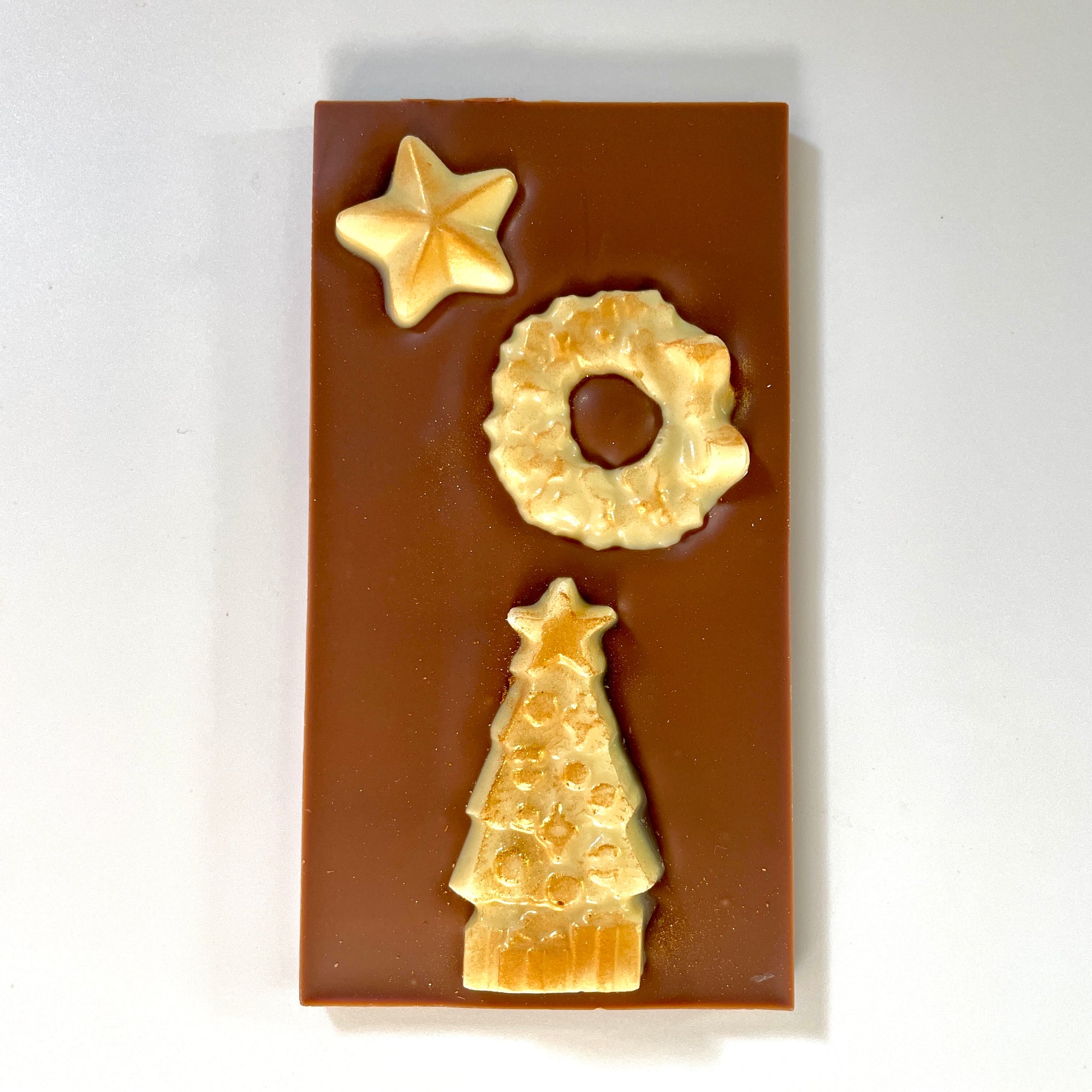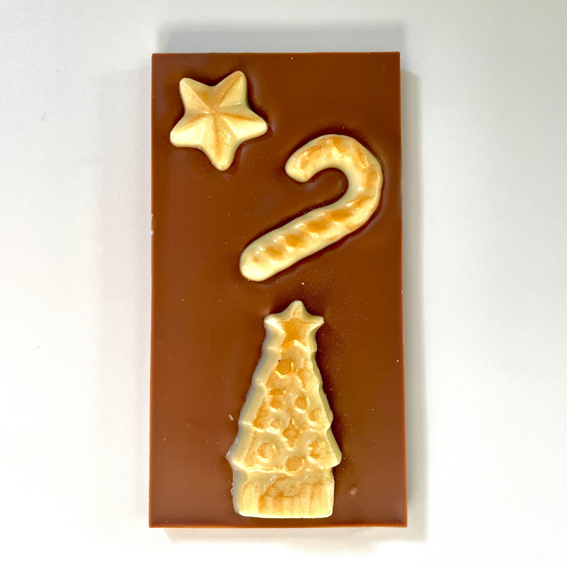 Taking inspiration from the sparkle of festive ornaments, this milk chocolate bar is adorned with a white chocolate Christmas tree, stars and one of the season’s iconic charms — either a candy cane, wreath or Christmas bell.